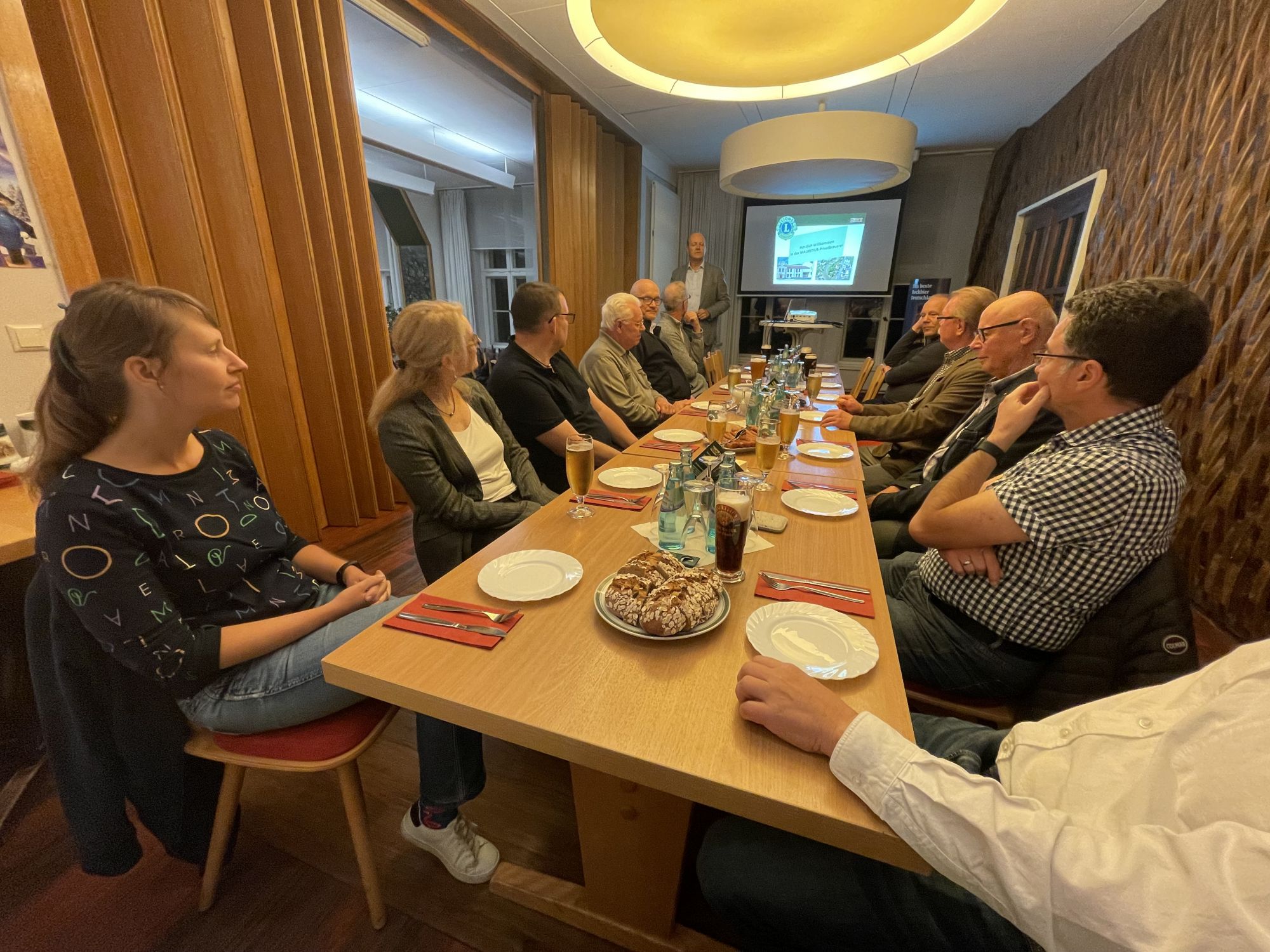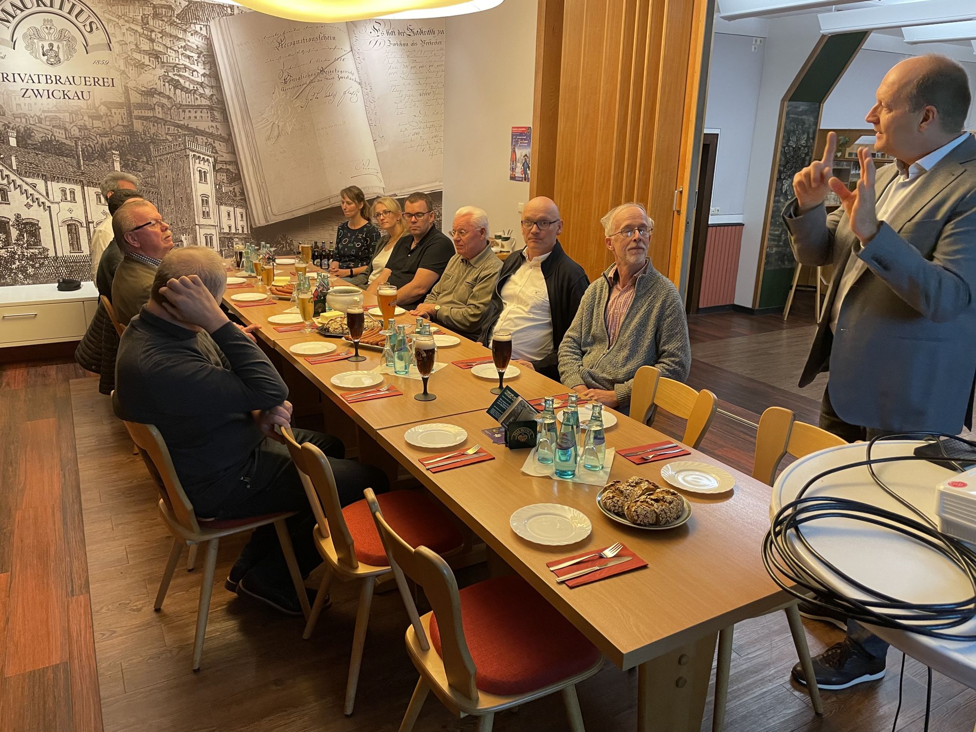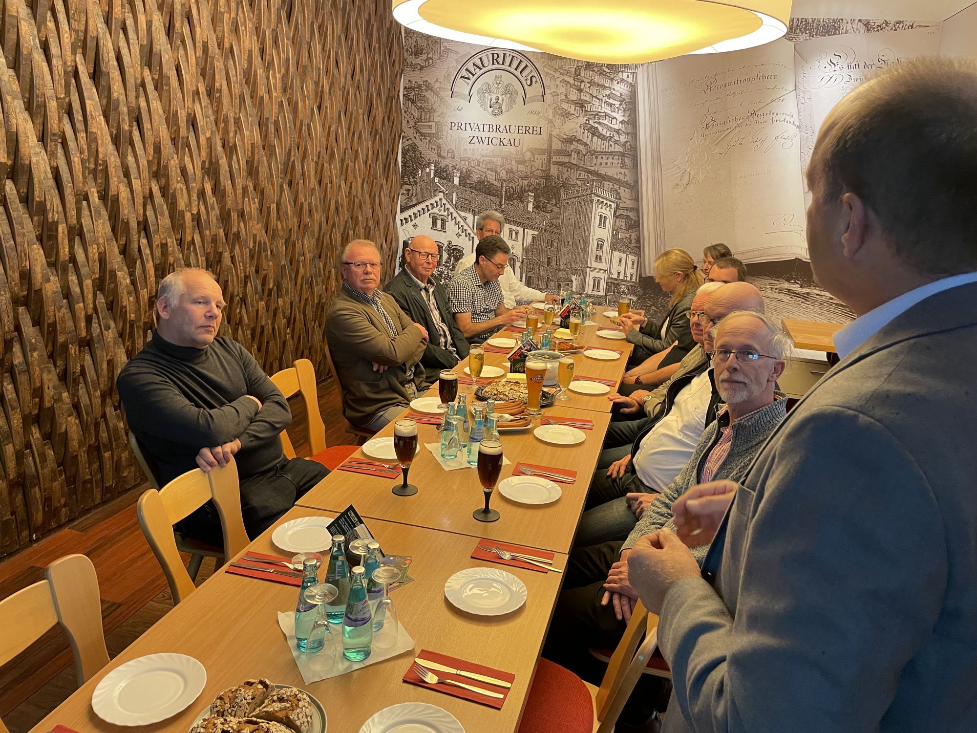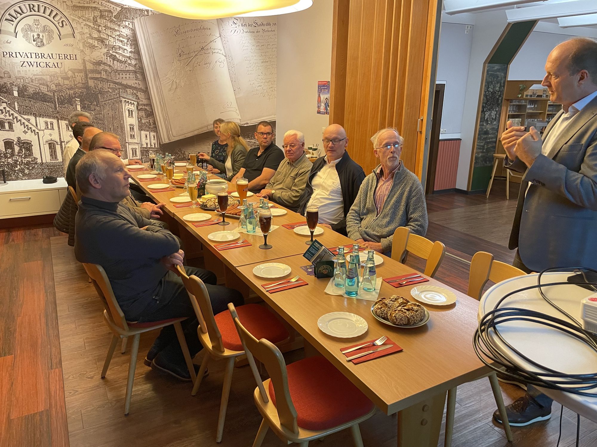 "Ein Schluck Heimat" war das Motto unseres Clubabends im Oktober, denn wir waren zu Gast in der Mauritius Privatbrauerei Zwickau. Nach der Begrüßung durch den Geschäftsführer Herr Jörg Dierig und einem leckeren Begrüßungsbier wurden wir auf eine Führung eingeladen, die uns in das Sud- und Gärhaus führte. Herr Maximilian Dierig (Diplom-Braumeister und Leiter der Qualitätssicherung) gewährte uns interessante Einblicke in die Produktion des traditionsreichen Zwickauer Bieres. An dieser Stelle durften wir exklusiv das Zwickel probieren, das unfiltrierte Bier, direkt abgefüllt ins Glas aus einem 18 Meter hohen Tank. Anschließend wurden wir auf einen kleinen Imbiss eingeladen, bei dem uns Herr Jörg Dierig Einblicke in die Geschichte und Stärken der Mauritius Privatbrauerei gab. Er hatte einige Highlights vorbereitet, unter anderem die Verkostung eines neu kreierten Bockbierbrotes sowie die Vorstellung des Rotary Adventskalenders 2023, der zum Preis von 5€ attraktive Gewinne verspricht und dem guten Zweck dient. Der Abend klang beim Probieren des Mauritius-Sortiments mit interessanten Gesprächen über das Zwickauer Bier aus. Wir bedanken uns für die herzliche Gastfreundschaft und den sehr gelungenen Abend.